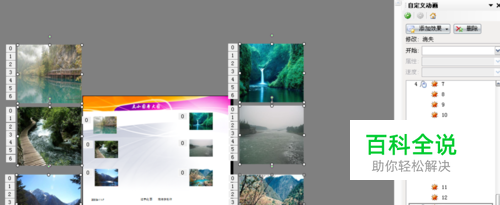 2.全选6张大的图片,设置自定义动画为之前、消失,全选6张小的图片,设置自定义动画为之前、出现,如图所示: