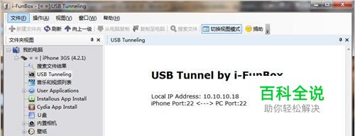 3.打开i-Funbox,并点击USB Tunneling,连接本地协议后,i-Funbox中的USB Tunneling开始闪烁。这时i-Funbox中会显示: USB Tunnel by i-FunBox Local IP Address: 10.10.10.18 iPhone Port:22 <---> PC Port:22 Connected:2(已经成功连接SSH协议,没有连接是显示为0)