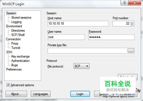 4.记住上面的网络地理10.10.10.18和端口22,将其填入WinSCP的设置当中。 默认用户名root、默认密码alpine,填写后点击Save。勾选Save Password,再点OK来保存 保存后就不用担心下一次记不住密码了,点击Login连接。 开始连接进程