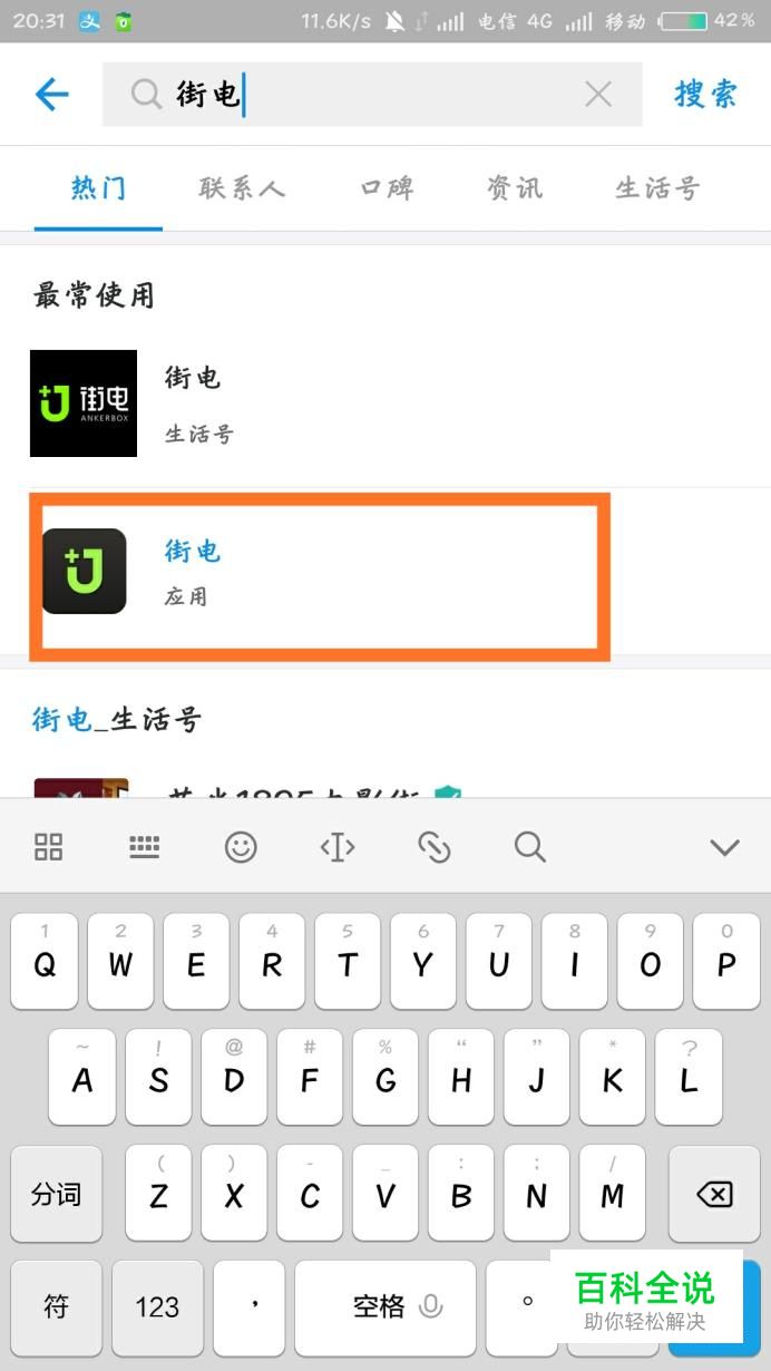 打开支付宝APP,在搜索栏搜索"街电",就出来如下的界面,我们点一下"应用"。