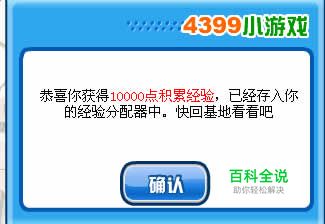 恭喜你活获得10000点积累经验。已经存入你的经验分配器中。快回基地看看吧