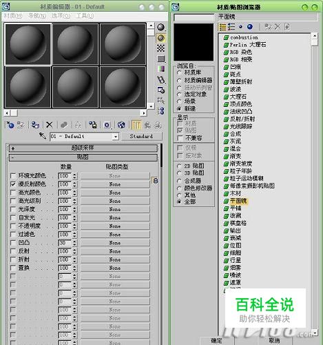 第二步:设置两个平面材质。选中顶视图中的平面,单击主工具栏中的“材质编辑器”按钮,打开“材质编辑器”对话框。选中一个材质样本球后展开“贴图”卷展栏,勾选中“漫反射颜色”材质通道,并单击其右侧的“None”按钮,打开“材质/贴图浏览器”对话框,接着在其中选中“平面镜”贴图并返回,如图2所示。 图2 3ds Max选择材质