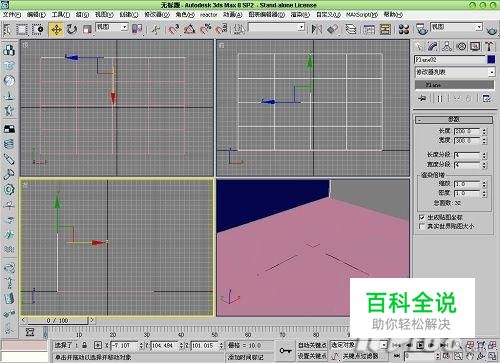 第一步:启动3ds max8中文版,进入“创建→几何体”子命令面板中,单击“平面”按钮,在顶视图和前视图中各创建一个平面,接下来转入到“修改”命令面板中,修改它们的参数值。在“参数”卷展栏中的设置它们的“长度”为200,“宽度”为300,其它参数值默认,然后单击主工具栏中的“选择并移动”工具,将两个平面调整为相互垂直的状态。如图1所示。 图1 用3ds Max创建平面