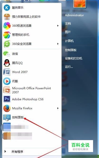 打开电脑,点击桌面左下角的windows标志,点击“控制面板”;