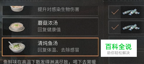 清炖鱼汤,这个食谱需要鱼和冰块,能恢复体温,去除感冒,如下图所示