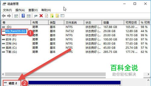 在磁盘管理窗口中,我们点击一下自己的U盘盘符,下面就可以显示该U盘在这个电脑中的磁盘标识,现在我这里显示的是标识为“磁盘2”。箭头位置那里。这个上位置选记住,等下需要用到。