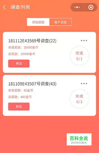 点击问卷列表中的调查,成功完成调查后系统将自动发放相应金币奖励,也可以在“个人中心”中的“奖金明细”中查看您的金币到账情况。