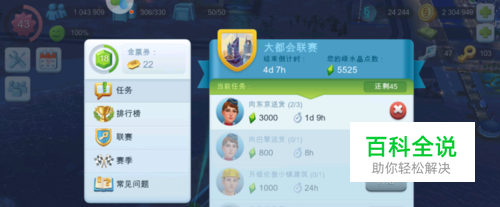 市长竞赛玩法的得分计算:参与的话,就需要在里面完成一系列的任务,市长的任务都是一样的,每一个任务都会有时间的限制,只要玩家在规定的时间内完成了任务,就可以获得绿水晶点数,也就相当于比赛的积分。