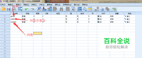 第一步:如何输入数据,在【变量视图】中设设置3个变量,分别为【group】、【state】和【number】表示不同年龄组,不同看法以及不同例数,在group的变量,点击【值】,在出现的窗口中,填入【值】为1,【标签】为年龄组1,然后点击添加,再增加值2,同理设置为年龄组2,(可根据研究定值标签但是需要自己明白是什么意思,)