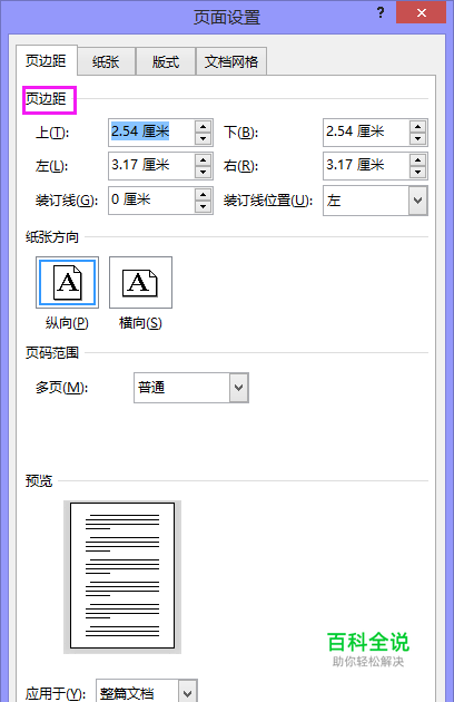 调出【页面设置】,在【页边距】选项卡中可以看到上下左右的设置。