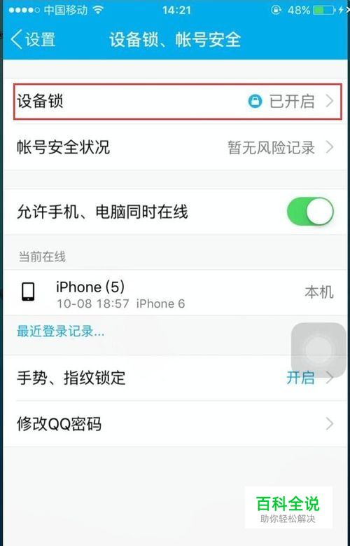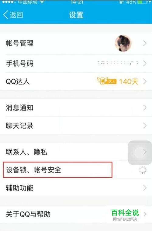 点击完设备锁、账号安全后在弹出的页面中点击设备锁。如下图