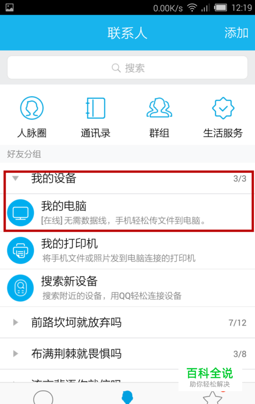 打开手机QQ,切换到“联系人”面板,依次点击“我的设备”—“我的电脑”。