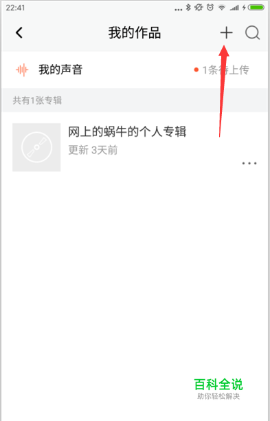 进入我的作品页面,里面只有一个默认的个人专辑,这个时候选择点击页面右上角的“+”会弹出三个选项,选择“创建专辑”。