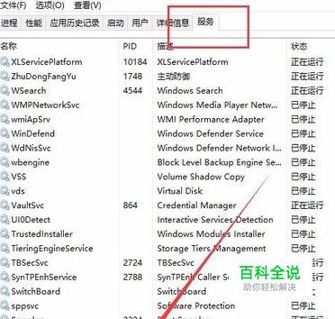 打开Win10系统任务管理器主页面。在Win10系统任务管理器主页面中,点击页面顶端“服务”选项卡