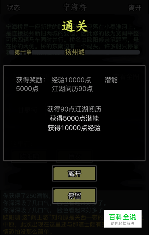 最后将其打倒后,欧阳啸会对我们说一段语重心长的话语,(和之后的自由探索有关的,如果大家对自由探索感兴趣,可以根据这一条线索继续往前行。) 获得1阅历和250潜能,我们再和欧阳啸对话后,就通关了。