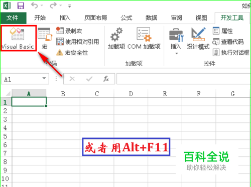 打开VBE环境 打开Excel工作簿后,通过点击“开发工具”选项卡的“Visual Basic”按钮或用快捷键“Alt + F11”打开VBE环境,如图所示。
