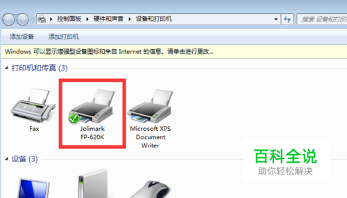 连接好打印机,并安装驱动,这一步很简单,我就不啰嗦了。装好后,在电脑系统会如图显示。
