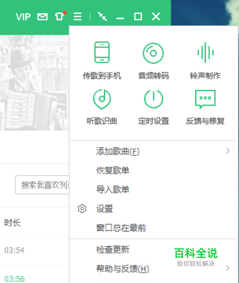 用电脑打开qq音乐软件,在右上角处找到三衡线,点击即可看到“铃声制作”
