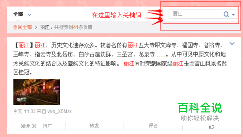 在主页上的搜索框输入你需要搜索的关键词,注意:不要在大搜索框内搜索,而是在全球风景圣地主页上的搜索框,我们就拿“丽江”这个关键词来做一下示范吧,输入关键词后搜索,就会把博主之前发过丽江这两个字的微博全部搜索出来了