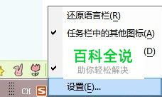 在任务栏对语言栏点击右键,选择设置一栏。(语言栏则是平时我们设置输入法的栏目)