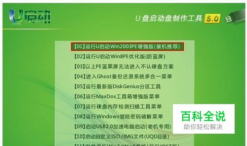 首先我想让同学们确认好自己的电脑品牌,这对我们今天的学习有很大的帮助。 我们会利用快捷键进入U启动主菜单后(后面会给出有关各个品牌电脑的快捷键,请大家到后面去查询),利用键盘上的上下方向键选择到“【01】 运行U启动Win2003PE增强版(推荐)”,然后按下“enter“,将进入U启动Win2003PE系统。 如下图所示: