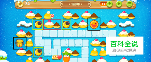 将新建太阳升满级后,紧挨着再建一个太阳,并不断升级。“雪石头”消灭后,瞄准图里红框的蛋糕继续攻击。(注:雪石头消灭后,会随机出现0-2个炮塔,全部卖掉。碰到贵重的,算运气哈,碰到0,也没关系。)