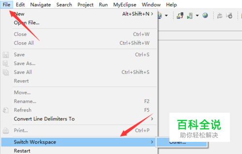 第一步: 查看 myeclipse的工作空间 首先依次选择 File ----> Switch Workspace ----> Other...然后就能看到弹出的框中显示 项目的存储位置。