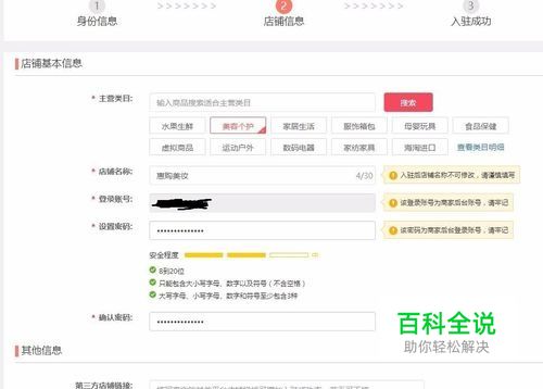 在店铺基本信息:主营类目、店铺名称等带※的的输入完毕,点击下一步;