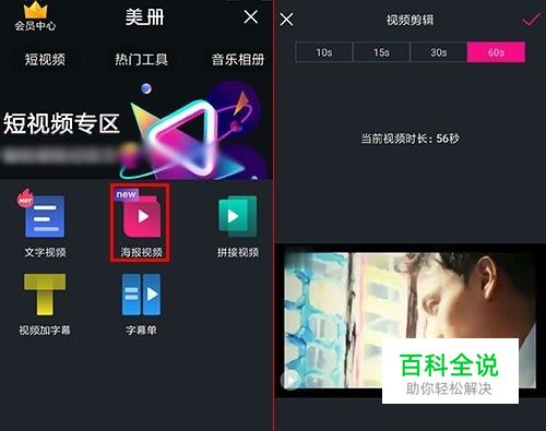 在美册的短视频专区,点击海报视频,导入要制作的视频。由于1000粉丝以下只能上传15s的视频,所以页面上方有专门为抖音用户设计的时长选项。 设置好时长,在页面下方,左右拖动视频两端的位置,可以快速剪切视频,都设置好以后,点击右上角对勾合成,跳转到视频编辑页面。