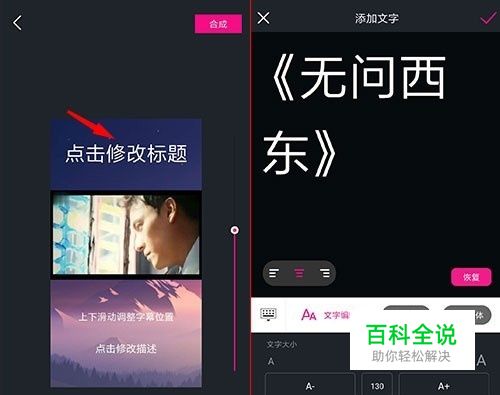 视频编辑页面,标题,视频,字幕,描述,这四部分都是居中排列的,上下拖动右侧圆圈,可以调整视频位置,其他三部分直接按住就可以上下滑动。 点击视频上方的文字到标题内容编辑页面,文字内容,文字排列和文字属性在这里都可以一键修改。