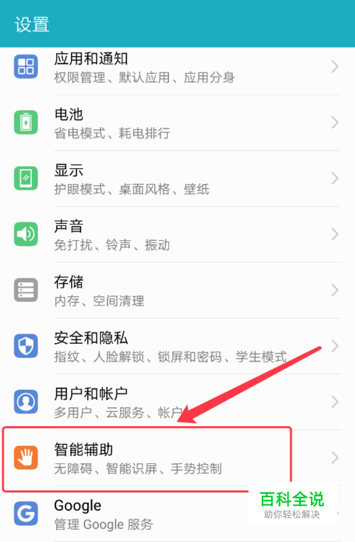 打开华为手机的【设置】界面,找到【智能辅助】导航,这里可设置关于手机的无障碍、智能识屏和手势控制的通道