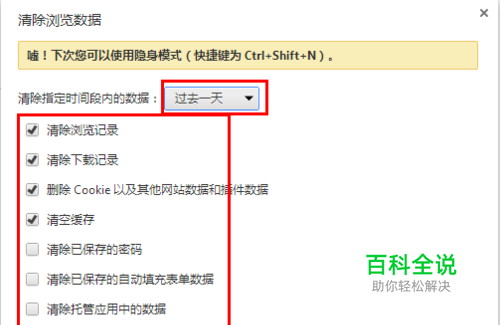 在打开的界面,我们可以选择清除的缓存的时间以及需要清除缓存的项目,设置完毕后,点击下方的“清除浏览器数据”按钮,浏览器即会开始清除缓存,之后重启浏览器即可
