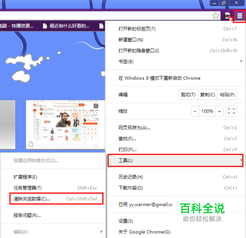 打开谷歌浏览器(Chrome),点击上方右侧的菜单按钮,依次进入“工具”--“清除浏览器数据”,或使用快捷键CTRL+SHIFT+DEL