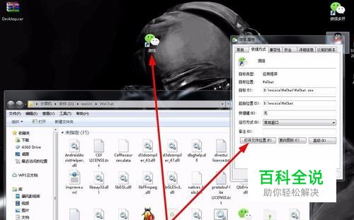 查看微信安装路径:选择微信程序快捷方式→单击右键→属性;如图,快捷方式在桌面的,在开始菜单的都是右键