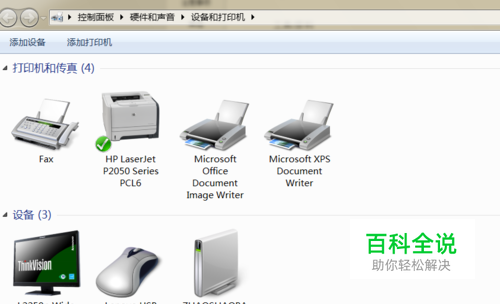 在开始菜单中找到设备和打印机选择,在弹出的页面中找到自己设定的打印机