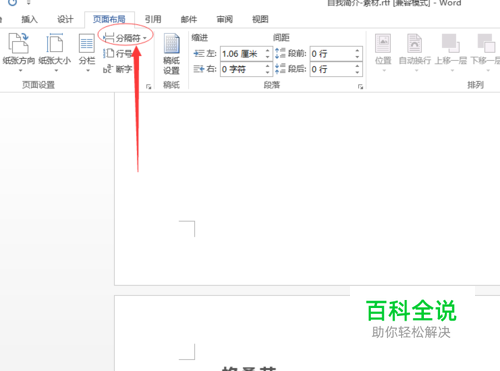 在第二篇诗歌的标题文字左侧插入分栏符。 1:点击标题文字左侧 2:点”页面布局“ 3:点”分隔符“ 4:点”分栏符“