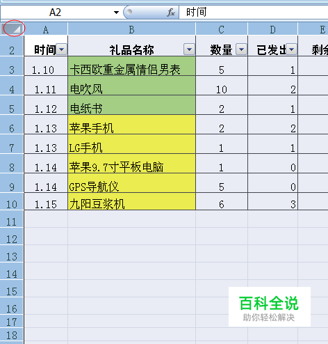 如图对这个表格进行全选,不仅要选择有数据有内容的,连同空白的一起选定,看见左上角红色的圈住的位置,单击就可以进行全选。