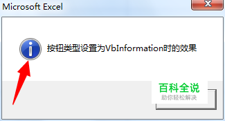 Buttons参数(可选参数):用于定义输出窗口的按钮样式及图标显示类型,常见按钮样式如下: 按钮类型 对应数值 描述 vbOKOnly 0 只显示 OK 按钮。 VbOKCancel 1 显示 OK 及 Cancel 按钮。 VbAbortRetryIgnore 2 显示 Abort、Retry 及 Ignore 按钮。 VbYesNoCancel 3 显示 Yes、No 及 Cancel 按钮。 VbYesNo 4 显示 Yes 及 No 按钮。 VbRetryCancel 5 显示 Retry 及 Cancel 按钮。 VbCritical 16 显示 Critical Message 图标。 VbQuestion 32 显示 Warning Query 图标。 VbExclamation 48 显示 Warning Message 图标。 VbInformation 64 显示 Information Message 图标。 如图为设置按钮类型为“VbInformation”时的效果: