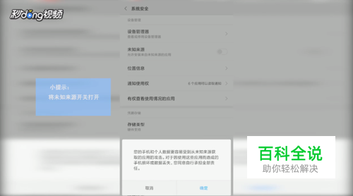 找弹出的提示风险的对话框中点击“确定”,此时手机即可允许安装未知来源应用