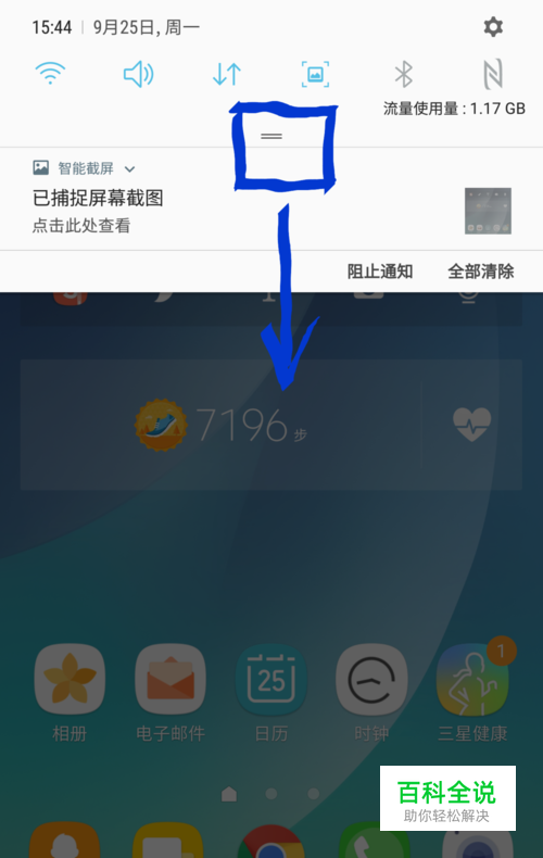 在屏幕顶端下拉通知栏位,如下图所示