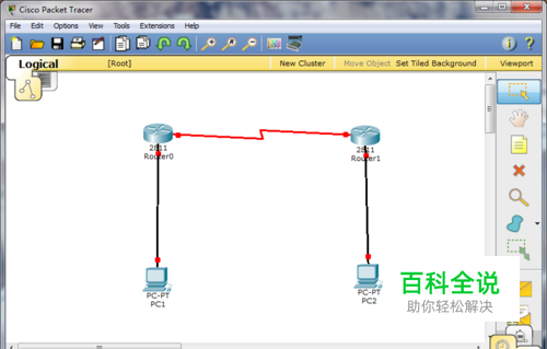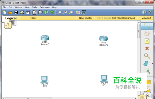 首先打开思科模拟器软件,找出二台2811类路由器和两台电脑,并将它们按顺序排列好,如下图所示: