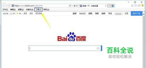 打开ie后,点击浏览器菜单上的工具,如下图所示