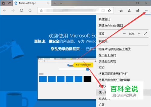 打开Microsoft Edge浏览器后,直接点击右上角的【...】设置图标,然后在点击下拉菜单里的【使用Internet Explorer打开】,如下图所示。