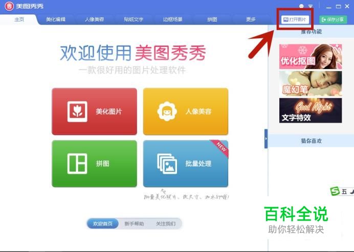 打开美图秀秀,点击屏幕右上角的“打开图片”。