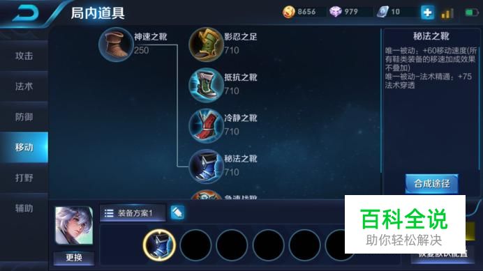 第一件装备,小编我会选择秘法之靴。 出装理由:秘法之靴这件装备不仅能够为弈星提供必要的移动速度,还能够为弈星提供75点的法术穿透能力。可以说这件装备大大提升了弈星都游走能力和输出能力。所以小编建议大家在玩弈星的时候,可以优先出秘法之靴。