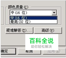 然后点击底下的应用。然后退出来。回到桌面。右键点击桌面。点击属性。属性中的“设置”选择“16位”