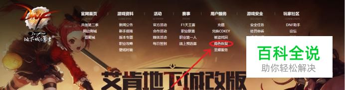 进入DNF官网首页,点击正上方菜单列表“用户服务”下面的“角色恢复”选项。