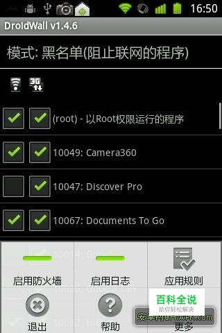 配置上网“黑、白名单” DroidWall(点击下载:DroidWall 1.4.8)这款软件的实用之处在于可以由用户决定哪些软件可以连接网络,哪些软件不可以。软件运行后,将网络接口设定为2G/3G网络,模式设为White list(白名单),然后在软件列表中将允许连接网络的软件勾选,再点击菜单中的Apply rules(应用规则)使设置生效。这样只有勾选的软件可以连接网络,未选择的软件自动列入黑名单,避免产生不必要的流量。