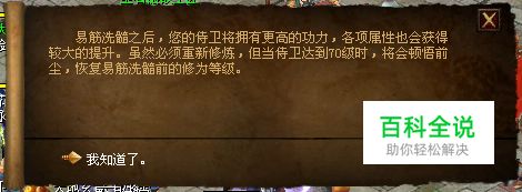 另外,当易筋洗髓后的侍卫重新修炼到70级时,将会顿悟前尘,恢复易筋洗髓前的修为等级。