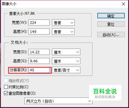 在图像大小的设置界面里,我们就可以看到图片的原本分辨率是多少,如小编打开的这张照片分辨率就是40。